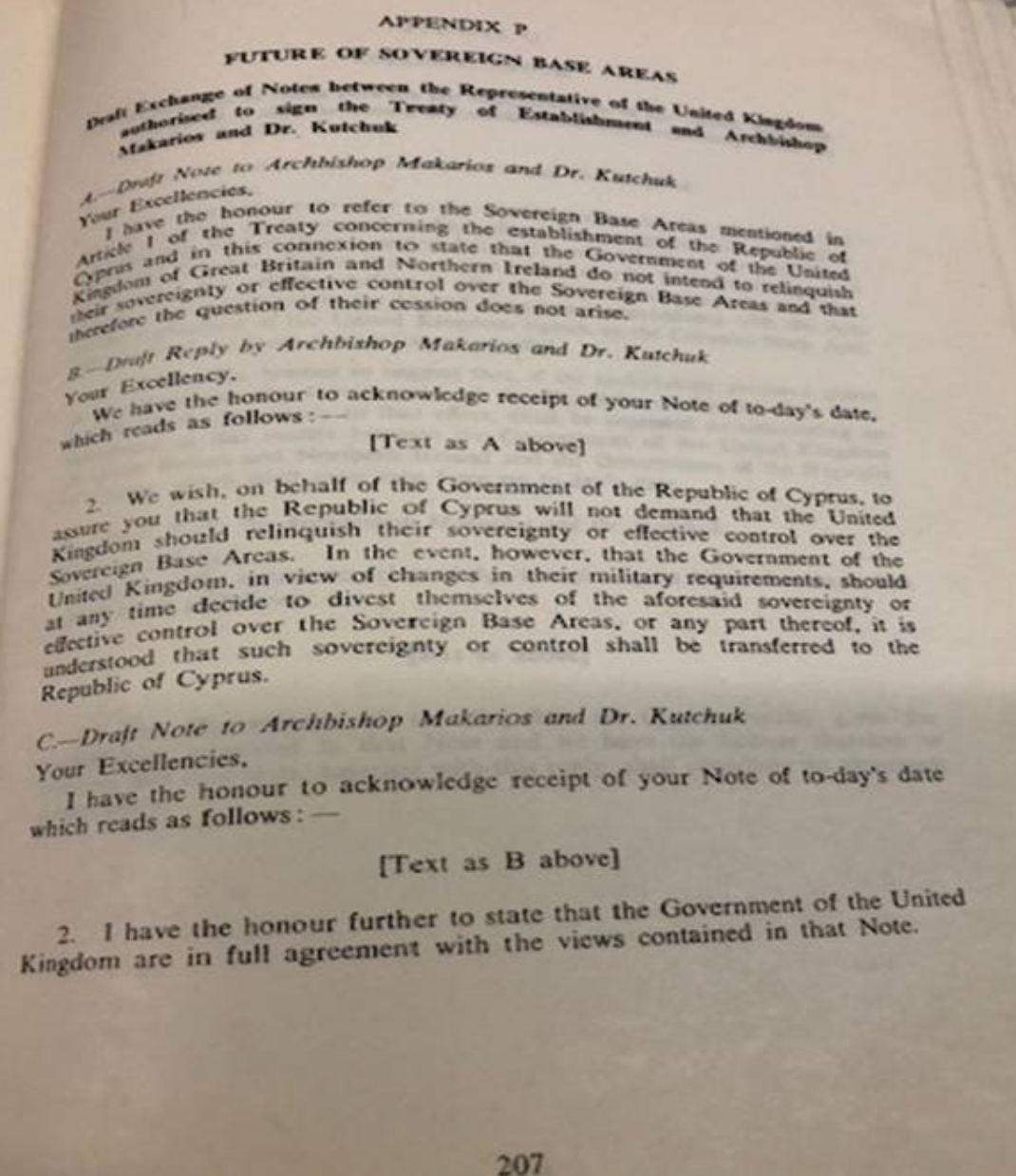 Appendix P covers the Exchanges of Notes between the Representative of the United Kingdom authorised to sign the Treaty of Establishment and Archbishop Makarios and Dr. F. Kutchuk and which clarifies the obligations of the United Kingdom if and when it will no longer need the Sovereign Base Areas (SBAs).