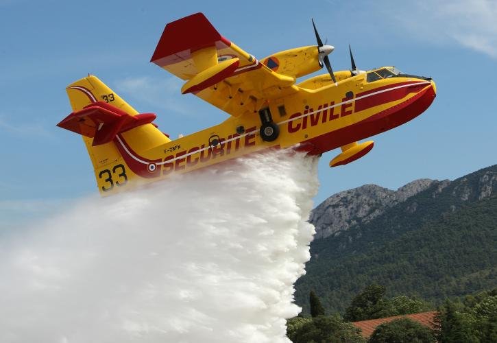 Το Canadair παραμένει επιπλέον στην επιφάνεια της θάλασσας, χάρη στους πλωτήρες του, κάτι που αναμφίβολα διευκολύνει την όλη επιχείρηση ανάσυρσης.