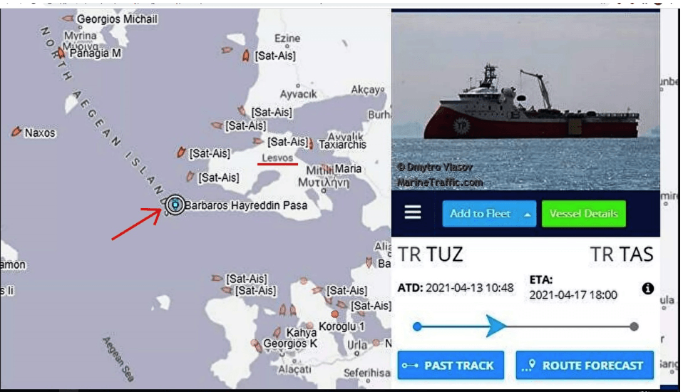 Την ώρα της Συνάντησης Δένδια-Τσαβούσογλου, οι Τούρκοι έδωσαν εντολή στο ερευνητικό τους Barbaros να περάσει από τα νερά της Λέσβου. Επί τόπου έσπευσαν ελληνικά πολεμικά. Στην εικόνα το στίγμα του τουρκικού σκάφους. (Εικόνα δημοσιευμένη σε ξένα ΜΜΕ.)