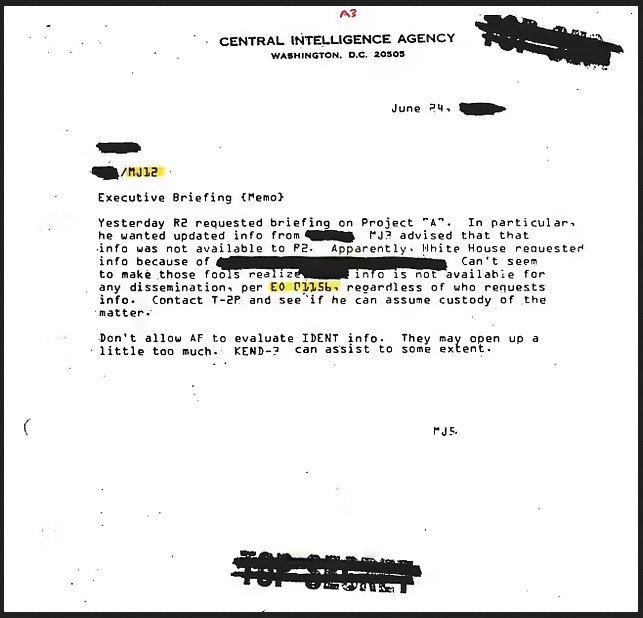 «Προφανώς, ο Λευκός Οίκος ζήτησε πληροφορίες», έγραψαν τα μέλη της MJ-12 σε ένα σημείωμα της CIA. «Δεν φαίνεται να καταλαβαίνουν αυτοί οι ανόητοι ότι [αυτές] οι πληροφορίες δεν μπορούν να δημοσιοποιηθούν».