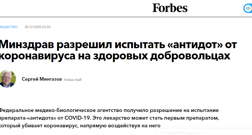 Βιάζονται γιατί αν βγει το φάρμακο εναντίον του covid19 τότε όλοι όσοι επένδυσαν σ΄εμβολιασμούς θα έχουν ηττηθεί σε όλα τα επίπεδα. Η Ρωσία αποφάσισε να δώσει τη χαριστική βολή στις ΗΠΑ; Αν επιβεβαιωθεί αυτή η πληροφορία αλλάζουν τα πάντα. Ρώσικο forbes: Το Υπουργείο Υγείας επέτρεψε να δοκιμαστεί το «αντίδοτο» για κορωνοϊό σε υγιείς εθελοντές.. 99,99% θεραπεία που σκοτώνει το COVID έχει αναπτυχθεί αναφέρουν ρώσικες πηγές! Το φάρμακο αναπτύχθηκε από επιστήμονες από το Ινστιτούτο Ανοσολογίας του FMBA (Federal Medical-Biological Agency) της Ρωσίας.