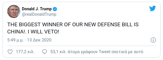 Με το πρόσχημα ότι το νομοσχέδιο ενδυναμώνει την Κίνα έγραψε στο Twitter: «Ο μεγαλύτερος κερδισμένος από το αμυντικό μας νομοσχέδιο είναι η Κίνα! Θα ασκήσω βέτο!» Έτσι για ακόμα μια φορά ο Πρόεδρος των ΗΠΑ δείχνει ότι δεν τον ενδιαφέρει τίποτα μπροστά στις σχέσεις που έχει με τον Ρετζέπ Ταγίπ Ερντογάν.