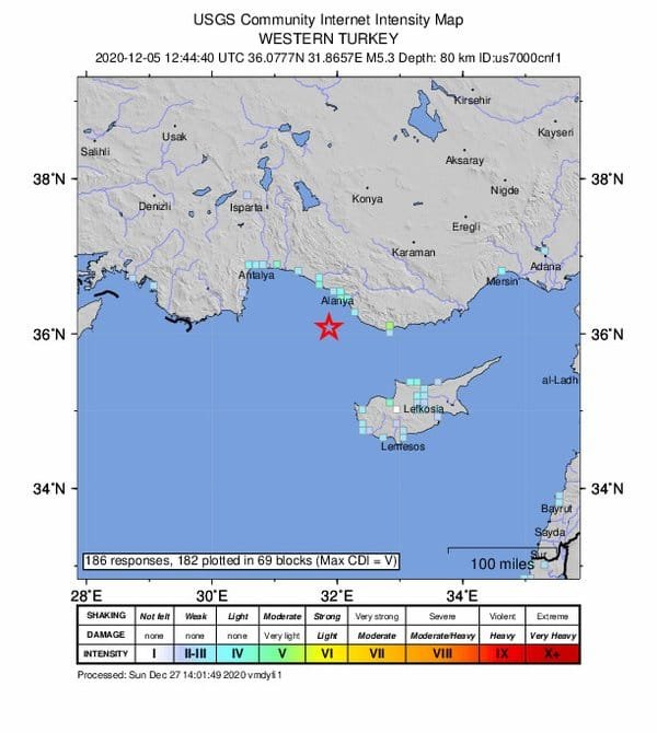 Αρχίζω με το τι έγινε στις 5 Δεκεμβρίου 2020. Εκείνη τη μέρα, η Ανατολική Μεσόγειος ταρακουνήθηκε λόγω σεισμού με δόνηση 5,3 βαθμών. Σύμφωνα με το Πρόγραμμα Σεισμικών Κινδύνων της Γεωλογικής Έρευνας των Ηνωμένων Πολιτειών της Αμερικής, το επίκεντρο αυτού του σεισμού ήταν 80 χιλιόμετρα κάτω από τη θάλασσα, δυτικά, αλλά αρκετά κοντά του Άκιουγιου, μεταξύ της Αττάλειας στη νότια ακτή της Τουρκίας και του Ακρωτηρίου Κορμακίτη στην τουρκοκρατούμενη βορειοδυτική ακτή της ΚΔ. (Δείτε: https://earthquake.usgs.gov/earthquakes/eventpage/us7000cnf1/executive).