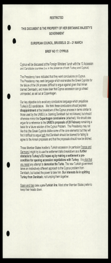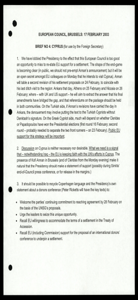 Στις 17 Φεβρουαρίου 2003 το Φόρεϊν Όφις ετοίμασε τις πιο κάτω οδηγίες προς τον Υπ. Εξωτερικών Τζακ Στρο ως “Brief No.4: Cyprus” για τη συνεδρία του Ευρωπαϊκού Συμβουλίου.
